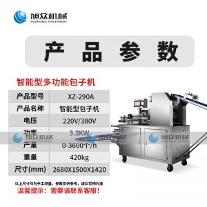 名稱XZ-290A智能卷式包子機 電源220/380v 功率3.3kw 產量0-36000個/h 尺寸2680*1500*1420mm 重量420kg 規格 其他