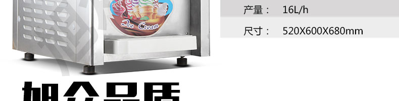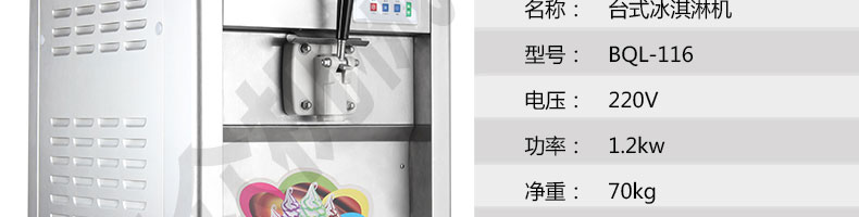 名稱BQL-116臺式冰淇淋機 電源220V 功率1.36kw 產量14-16L/H 尺寸520*600*680mm 重量70kg 規格 其他