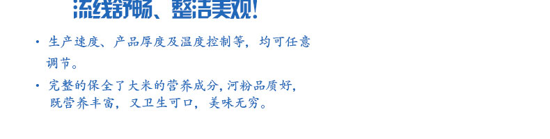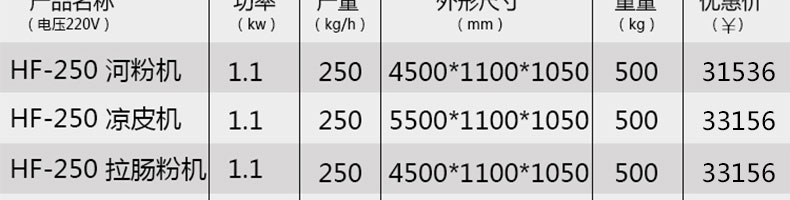 名稱SZ-HF-250涼皮機 電源220/380V 功率1.1/81kw 產量100/150/200/250kg/h 尺寸主機尺寸5500*1000*1050mm 外形尺寸5600*1200*1500mm 重量500kg 規格粉條寬度mm:4/6/8/10 其他