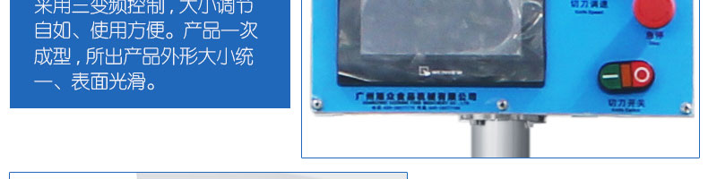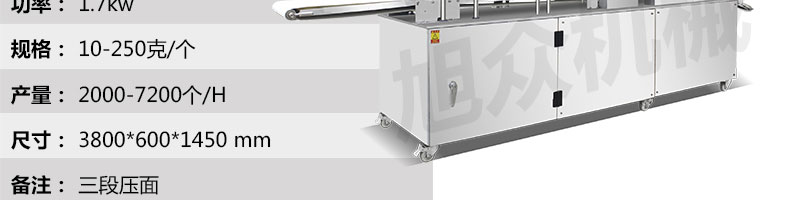 名稱MP900型刀切饅頭成型機 電源220/380V(見機器名牌) 功率1.7kw 產量2000-7200個/小時 尺寸3800*600*1450mm 重量450kg 規格10-250克/個 其他三段壓面