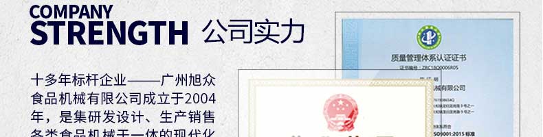 廣州旭眾食品機械有限公司是一家集科研開發,生產設計,營銷服務為一體的現代化生產企業?,F代化生產車間,精湛制造技術,所產機械歷經市場重重考驗,不斷贏得海內外客戶的贊譽。