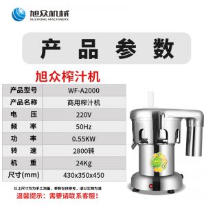 名稱WF-A2000商用榨汁機 電源220V 功率0.55kw 產量轉速:2800r/min 尺寸430*350*450mm 重量26kg 規格 其他
