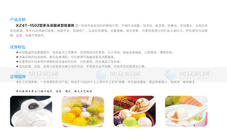 名稱XZ4T -1502多頭湯圓成型排盤機 電源220/380V(見機器銘牌) 功率4.5KW 產量0-15000個/h 尺寸2600x1200x1600mm 重量950kg 規格22-30mm(直徑) 其他