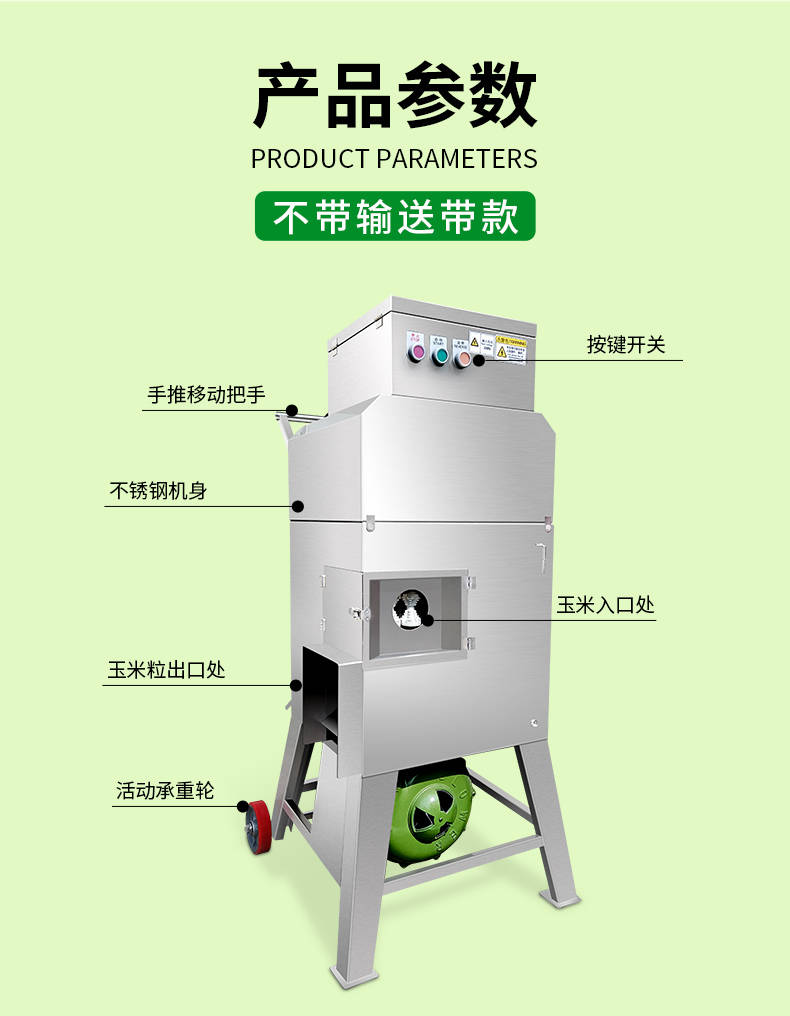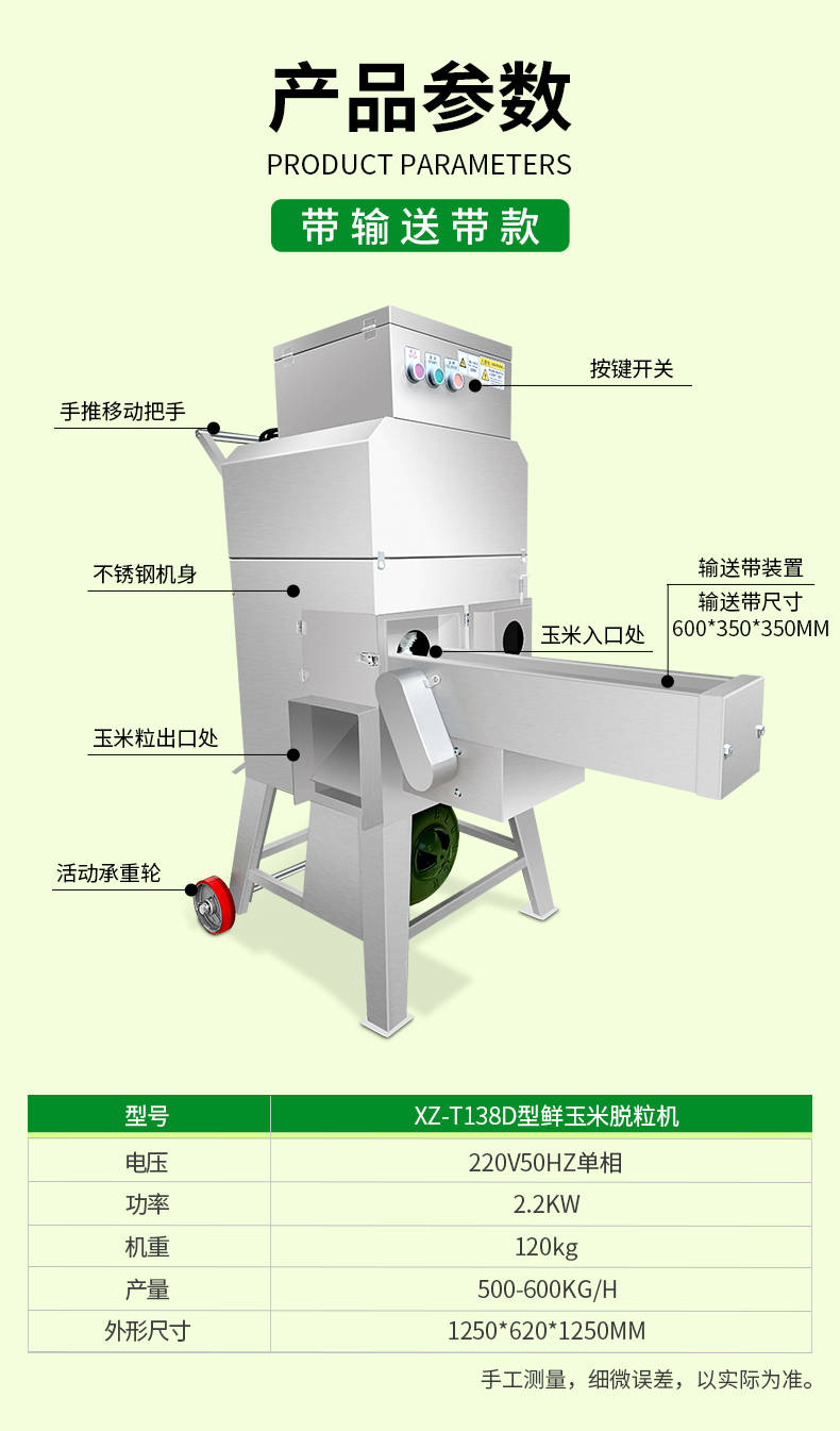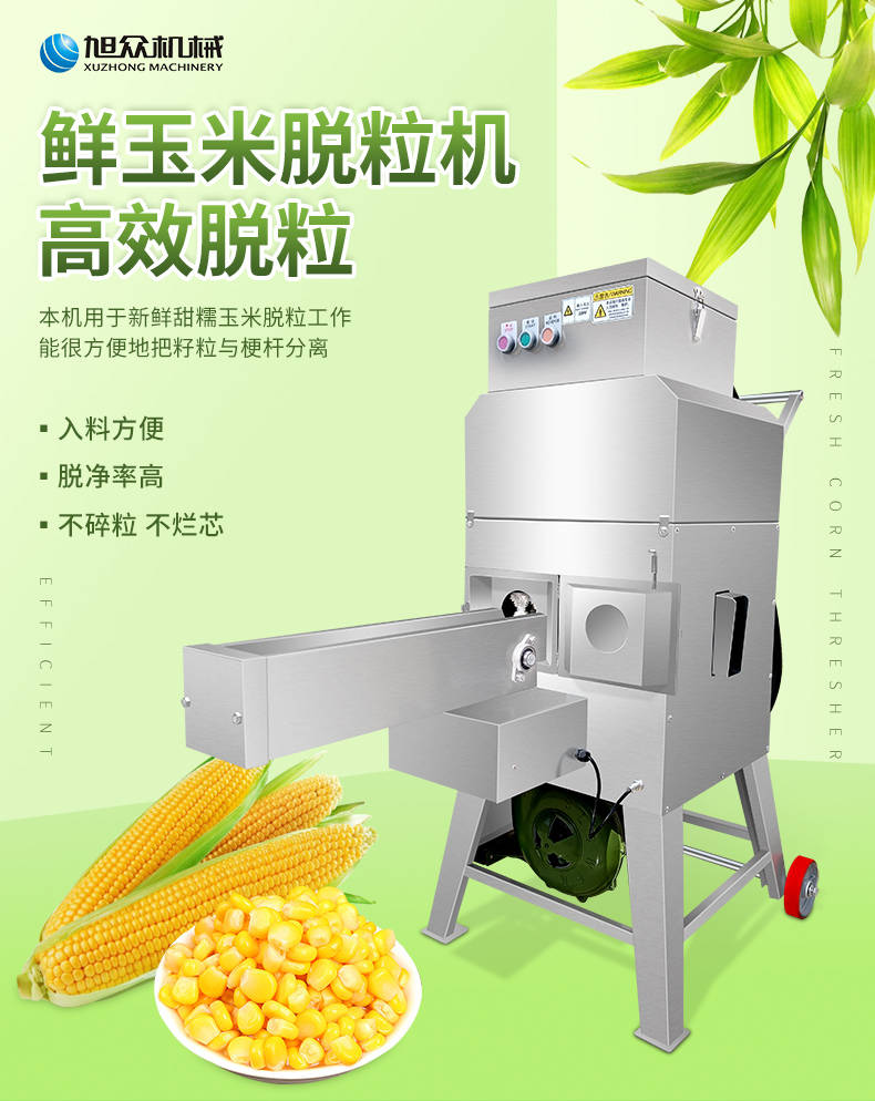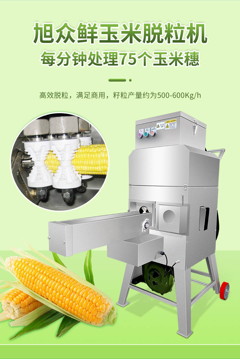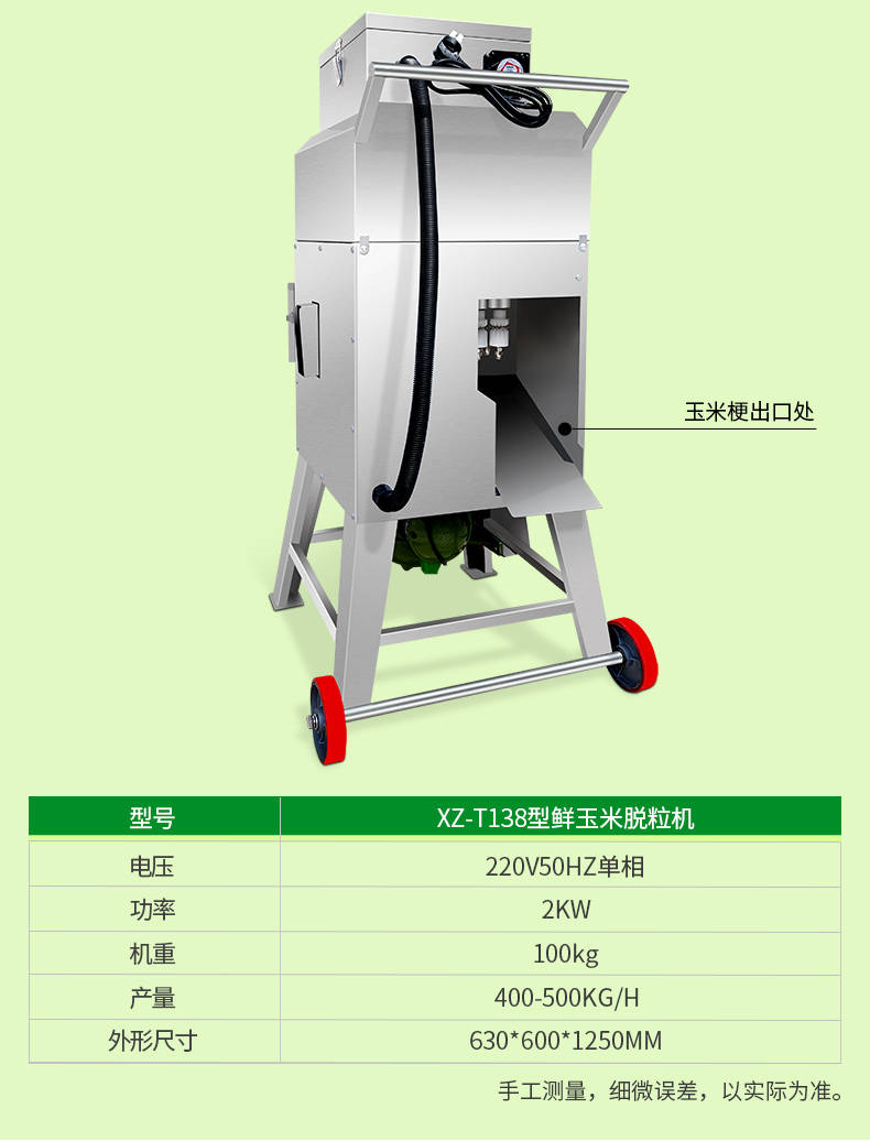 XZ-T138玉米脫粒機,鮮玉米脫粒機,高效脫粒。用于新鮮甜糯玉米脫粒工作,能很方便地把籽粒與梗桿分離。入料方便、脫凈率高、不碎粒不爛芯。每分鐘處理75個玉米穗。高效脫粒,滿足商用,籽粒產量約為500-600Kg/h