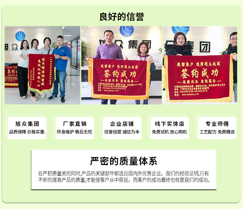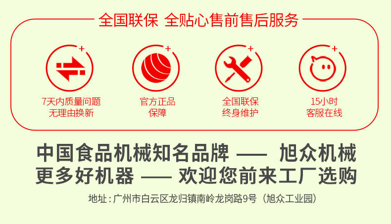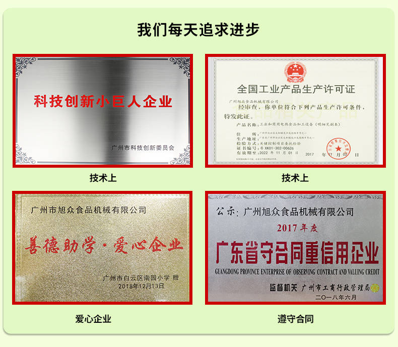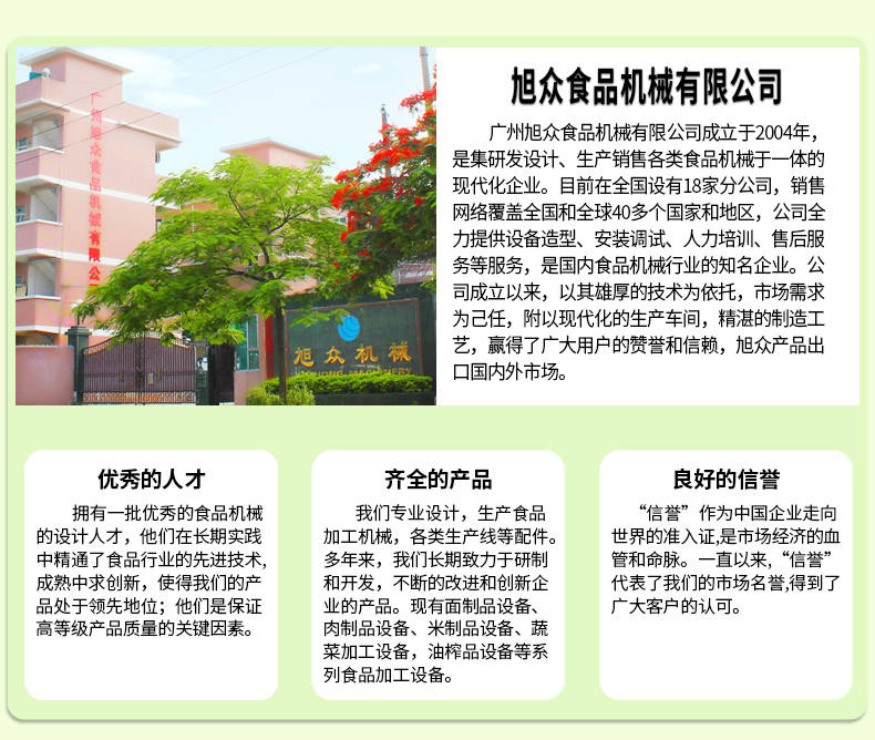 廣州旭眾食品機械有限公司是一家集科研開發,生產設計,營銷服務為一體的現代化生產企業。現代化生產車間,精湛制造技術,所產機械歷經市場重重考驗,不斷贏得海內外客戶的贊譽。
