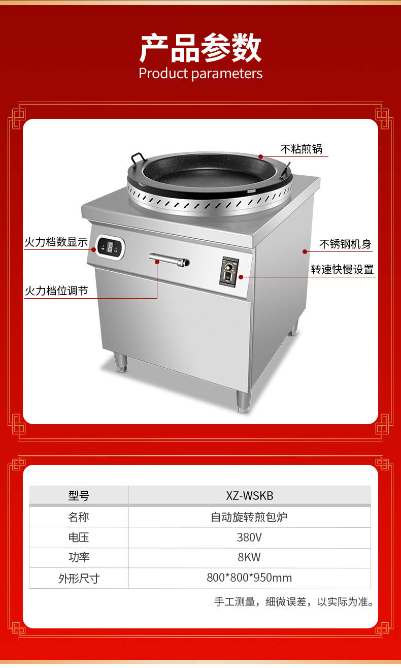 名稱XZ-WSKB自動(dòng)旋轉(zhuǎn)煎包爐 電源380V 功率8KW 產(chǎn)量請(qǐng)咨詢銷售員 尺寸800*800*950mm 重量請(qǐng)咨詢銷售員 規(guī)格請(qǐng)咨詢銷售員 其他