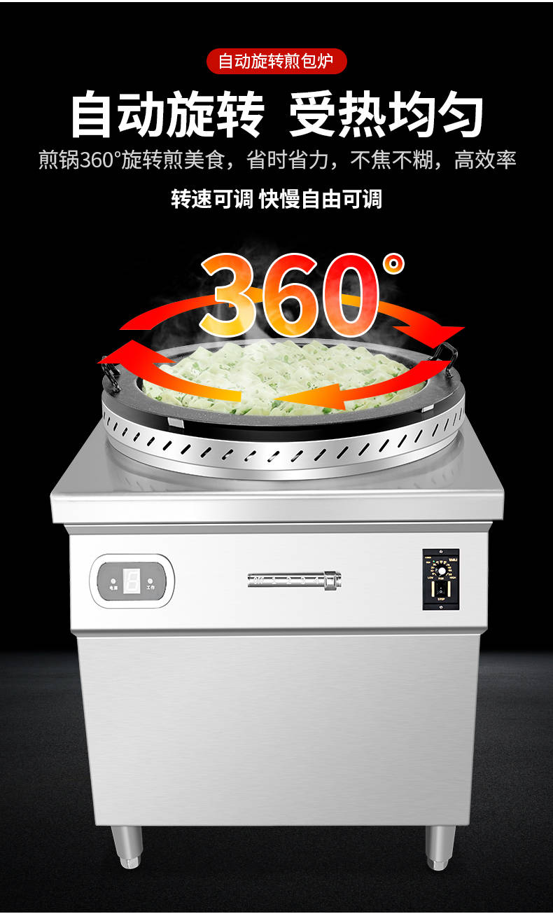XZ-WSKB自動(dòng)旋轉(zhuǎn)煎包爐,煎制各種美食鍋在手,各種煎包煎餃煎美食,輕松搞定。自動(dòng)旋轉(zhuǎn)、受熱均勻煎鍋360°旋轉(zhuǎn)煎美食,省時(shí)省力,不焦不糊,高效率轉(zhuǎn)速可調(diào)快慢自由可調(diào)。