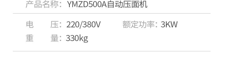名稱500A壓面機主圖 電源220/380v 功率3kw 產量 尺寸1300*755*1240mm 重量330kg 規格 其他