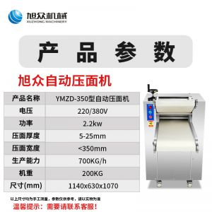 名稱YMZD-350自動壓面機 電源220/380V 功率2.2KW 產量700kg/h 尺寸1140X630X1070mm 重量200KG 規格壓面厚度5-25mm壓面寬度<350mm 其他
