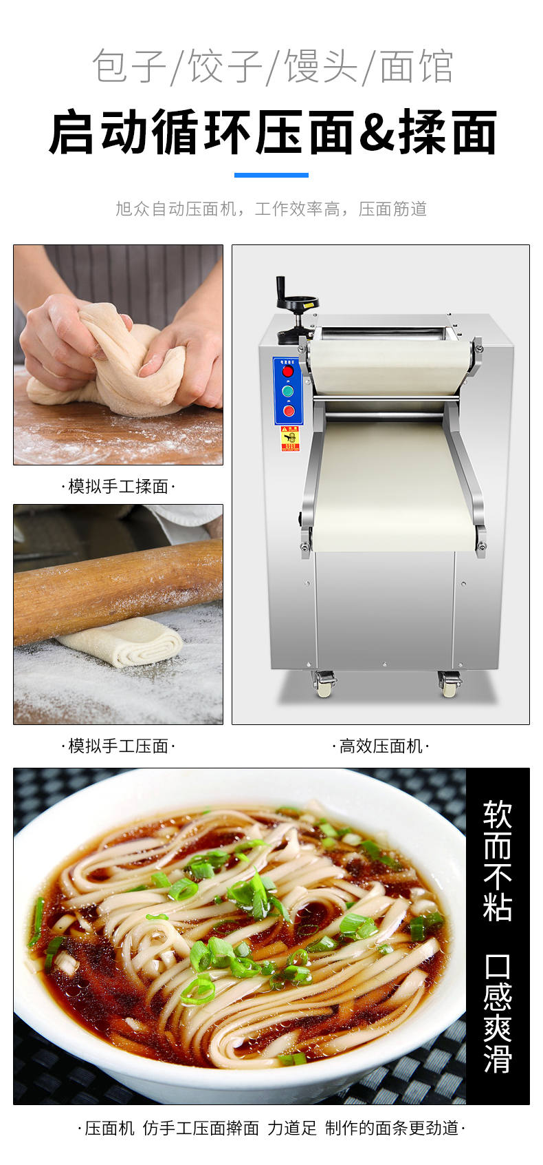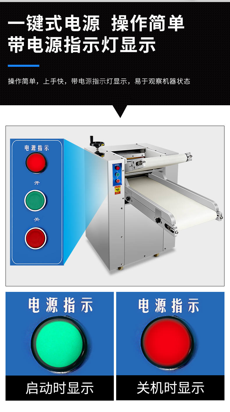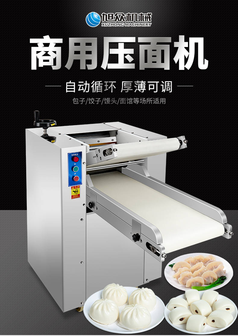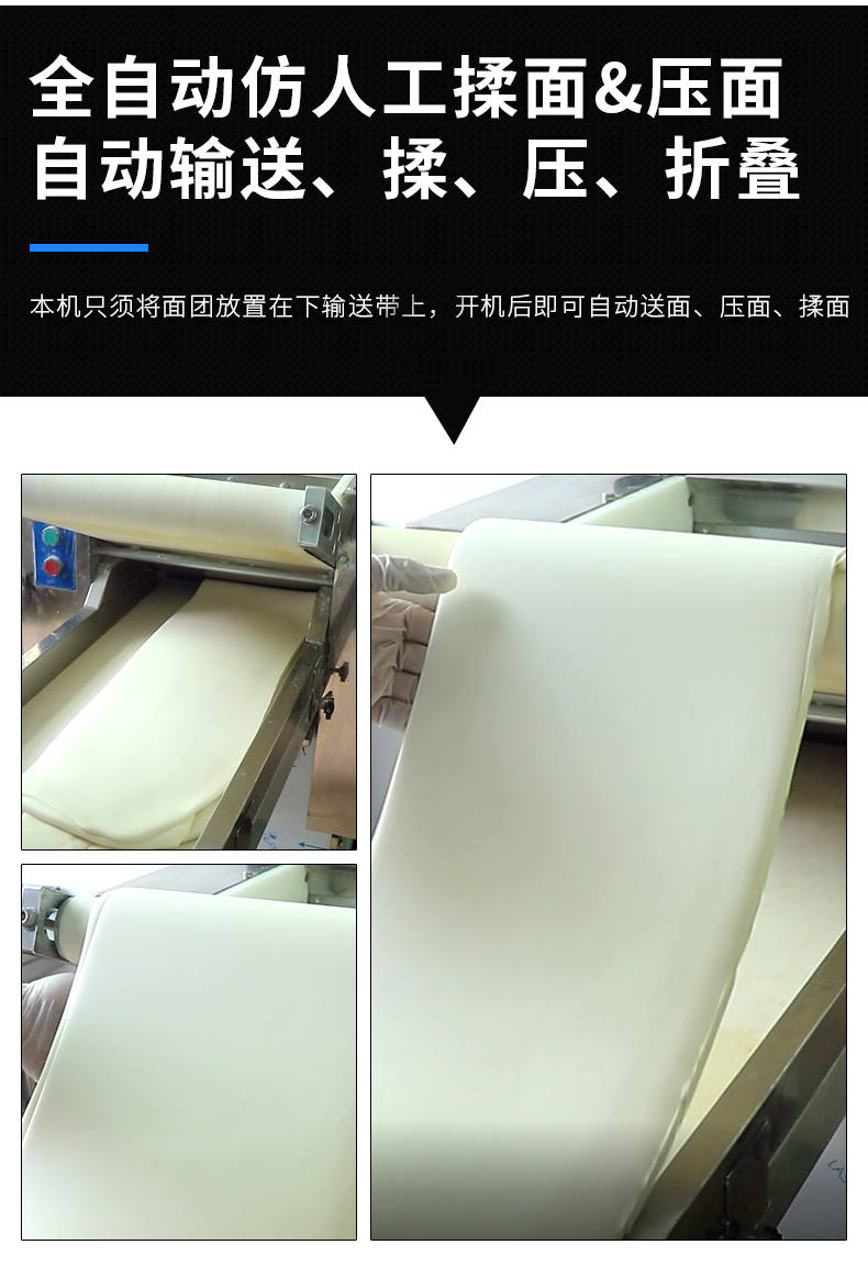 YMZD-350自動壓面機,自動循環、厚薄可調。包子、餃子、饅頭,面館等場所適用。啟動循環壓面、揉面。全自動仿人工揉面,壓面自動輸送、揉、壓、折疊。