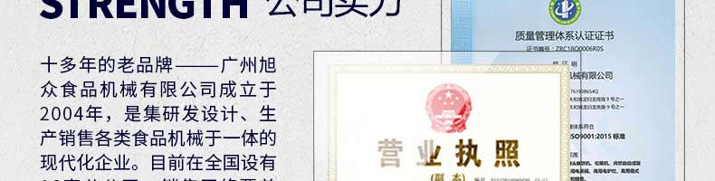 廣州旭眾食品機械有限公司是一家集科研開發(fā),生產(chǎn)設(shè)計,營銷服務(wù)為一體的現(xiàn)代化生產(chǎn)企業(yè)。現(xiàn)代化生產(chǎn)車間,精湛制造技術(shù),所產(chǎn)機械歷經(jīng)市場重重考驗,不斷贏得海內(nèi)外客戶的贊譽。